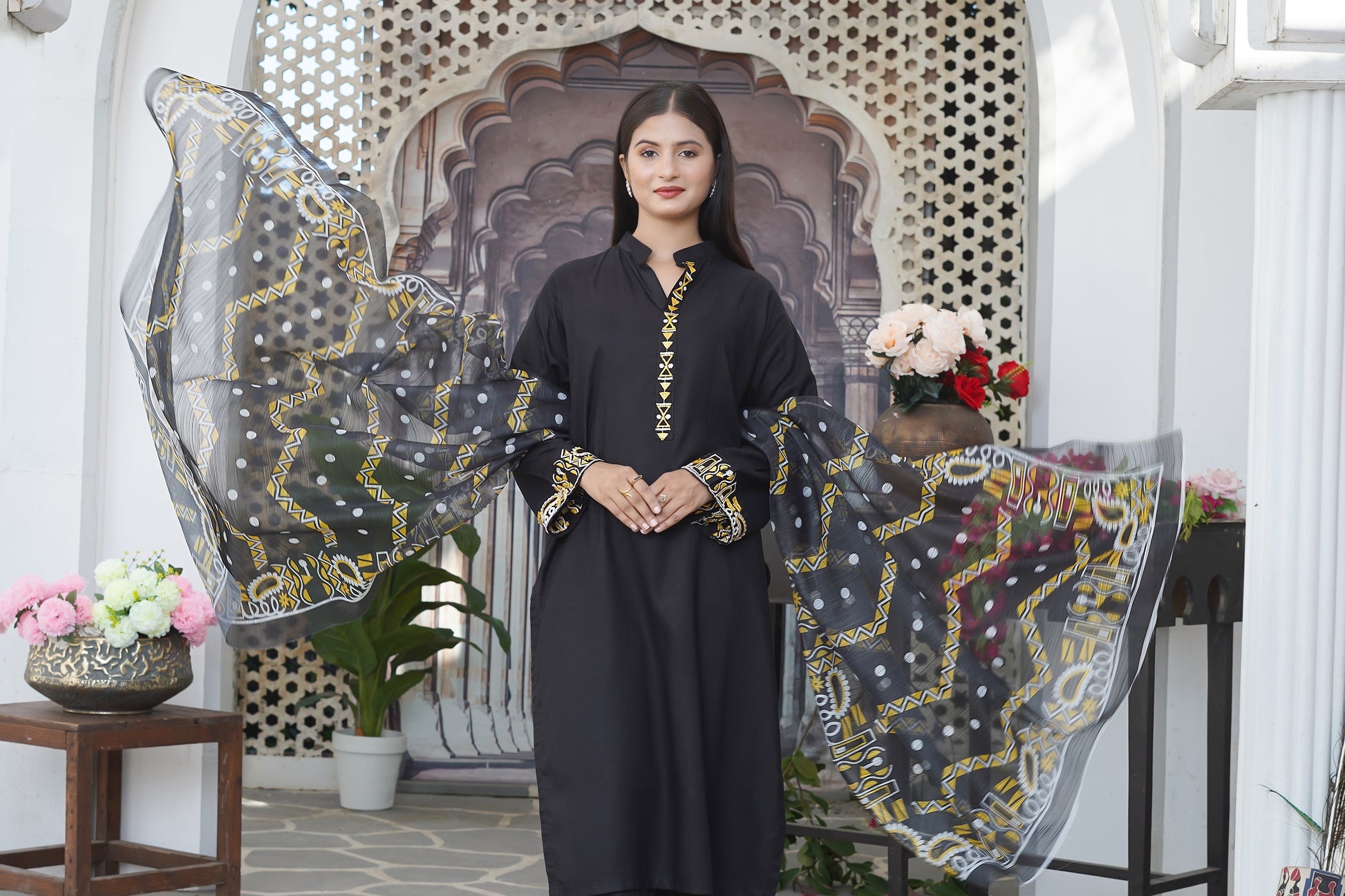 This exquisite Daily/Basic Wear kurta set is a versatile addition to your wardrobe. Crafted from high-quality linen fabrics in a sleek black color, the straight cut kurta features intricate embroidery work for a touch of elegance. Paired with a matching straight trouser and Manaar dupatta, this 3-piece set is perfect for all seasons. Embrace effortless style with this Regular Fit ensemble by Hamna Kalim.DUPATTA SIZE : 84 INC